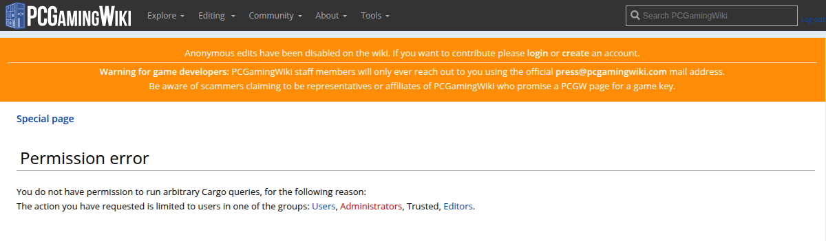 geon106 0 Share Posted Saturday at 01:13 PM Whenever I try and view lists on PCGamingWiki, the first page shows, but pressing "More" at the bottom gives the attached Permission Error. This is despite being logged in as a user. This happens on all lists when pressing the "More" button at the bottom Reply (Quote) Link to comment Share on other sites More sharing options...